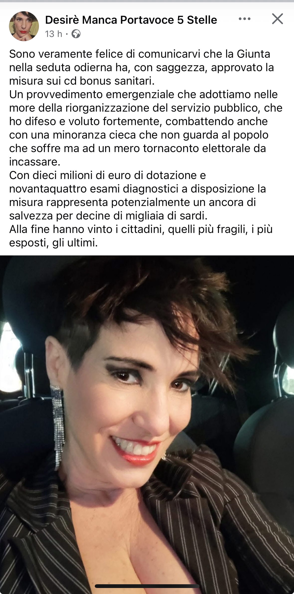 L’assessora Manca ieri in un post su Facebook ha esultato dopo aver fatto approvare i bonus sanitari dalla giunta regionale. Manca ha scritto: “Sono veramente felice di comunicarvi che la Giunta nella seduta odierna ha, con saggezza, approvato la misura sui cd bonus sanitari.