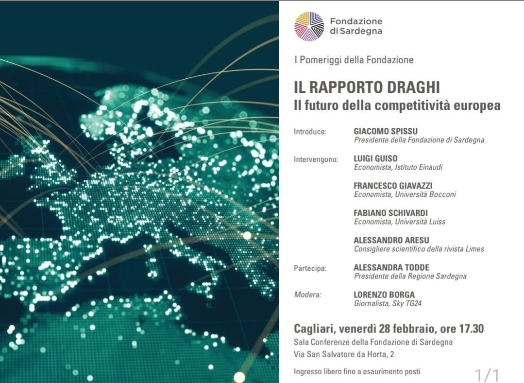 Venerdì 28 febbraio, alle ore 17.30, Cagliari diventerà per un pomeriggio il cuore del dibattito economico europeo. Nella Sala Conferenze della Fondazione di Sardegna verrà presentato Il rapporto Draghi – Il futuro della competitività europea, il documento curato dall’ex Presidente della BCE su mandato della Commissione Europea. Un’analisi rigorosa e un appello all’azione: l’Europa rischia di restare indietro nella corsa globale, frenata da produttività stagnante, carenze d’innovazione e dipendenze strategiche.